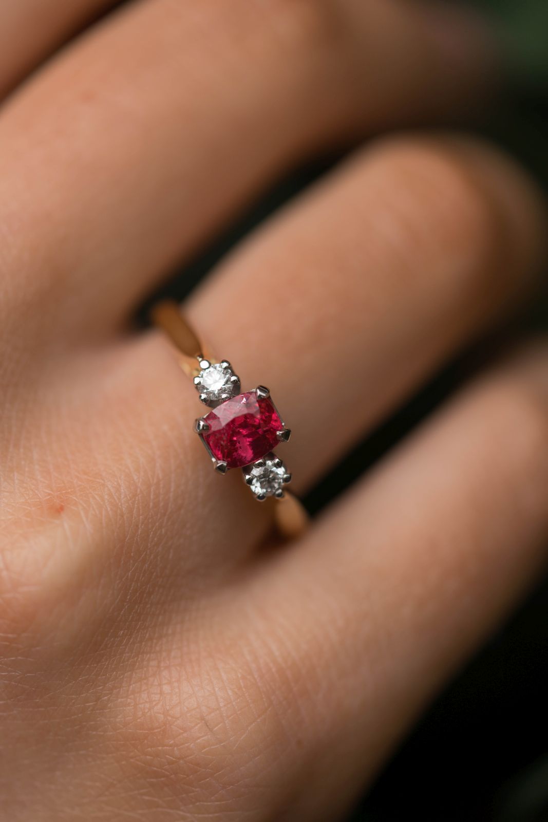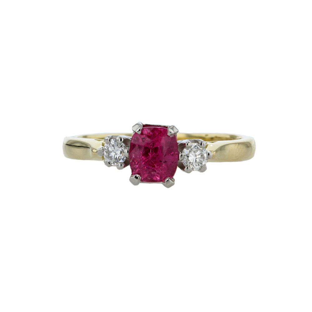 1.12ct cushion cut pink spinel with 2 0.10ct diamonds nestled on each side all set platinum for extra security with a warm 18ct. yellow gold band. Perfect for an engagement ring or a gemstone ring.