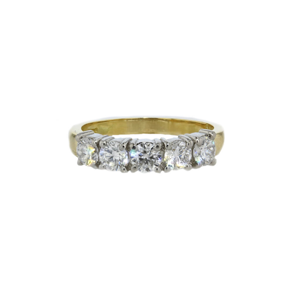 5 stone diamond eternity ring set with 5 brilliant cut diamonds set in a platinum setting and 18ct yellow gold band. This timeless classic will add glamour to existing rings or worn on it’s own as a statement ring. This ring is crafted in 18 yellow gold set with 5 round cut brilliant cut diamonds. The diamonds are set in platinum which allows their beauty to shine through.