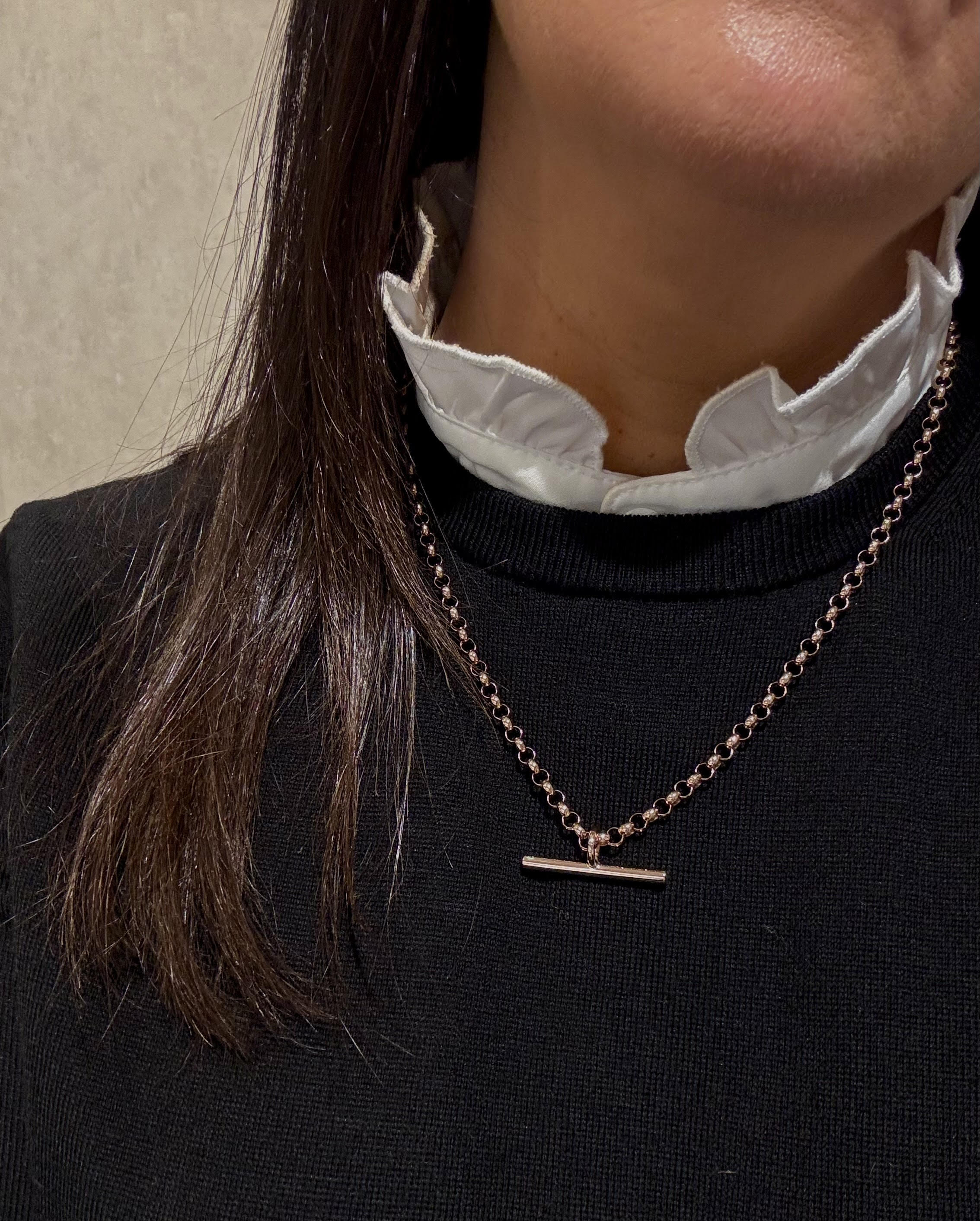 This beautiful rich rose gold round link chain with a solid gold handmade T-Bar will make a stunning addition to any jewellery collection.