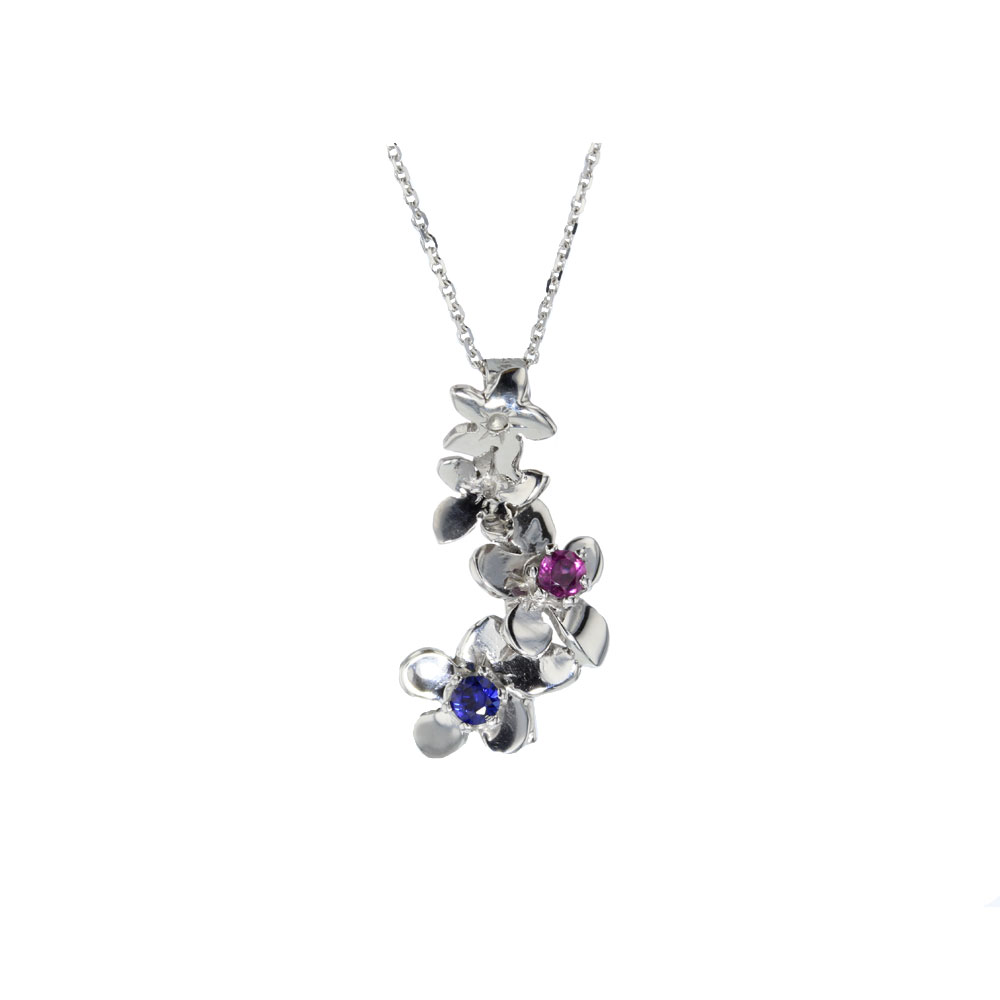 9ct. White Gold Pendant set with White Gold Burren Flowers, Rhodolite and Synthetic Sapphire.