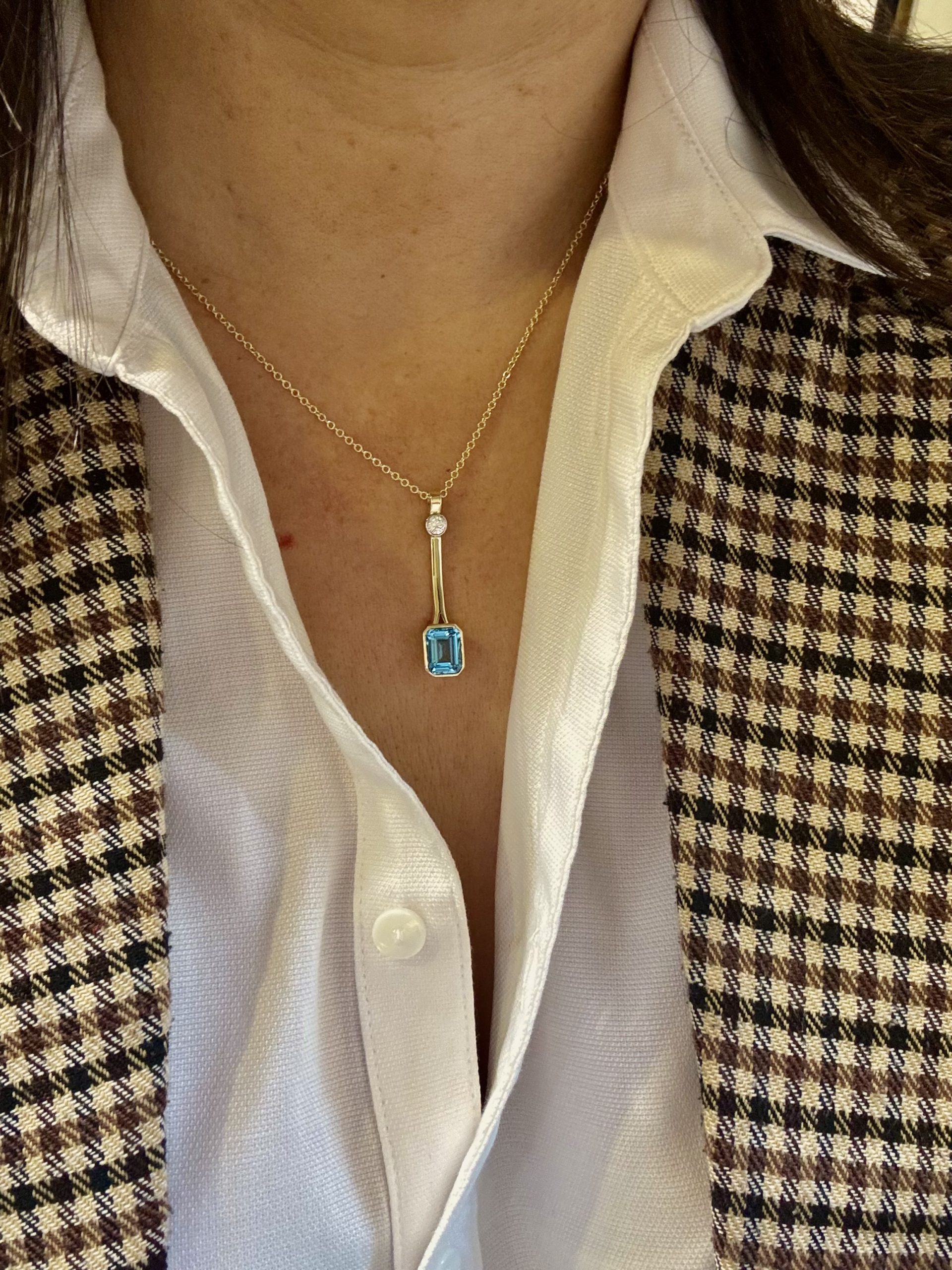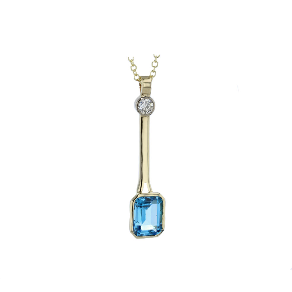 Bespoke handmade 9ct gold pendant with 0.20ct LAB diamond in a bezel setting with emerald cut 2.80ct London blue topaz also nestled in a secure bezel setting. A unique and contemporary piece.