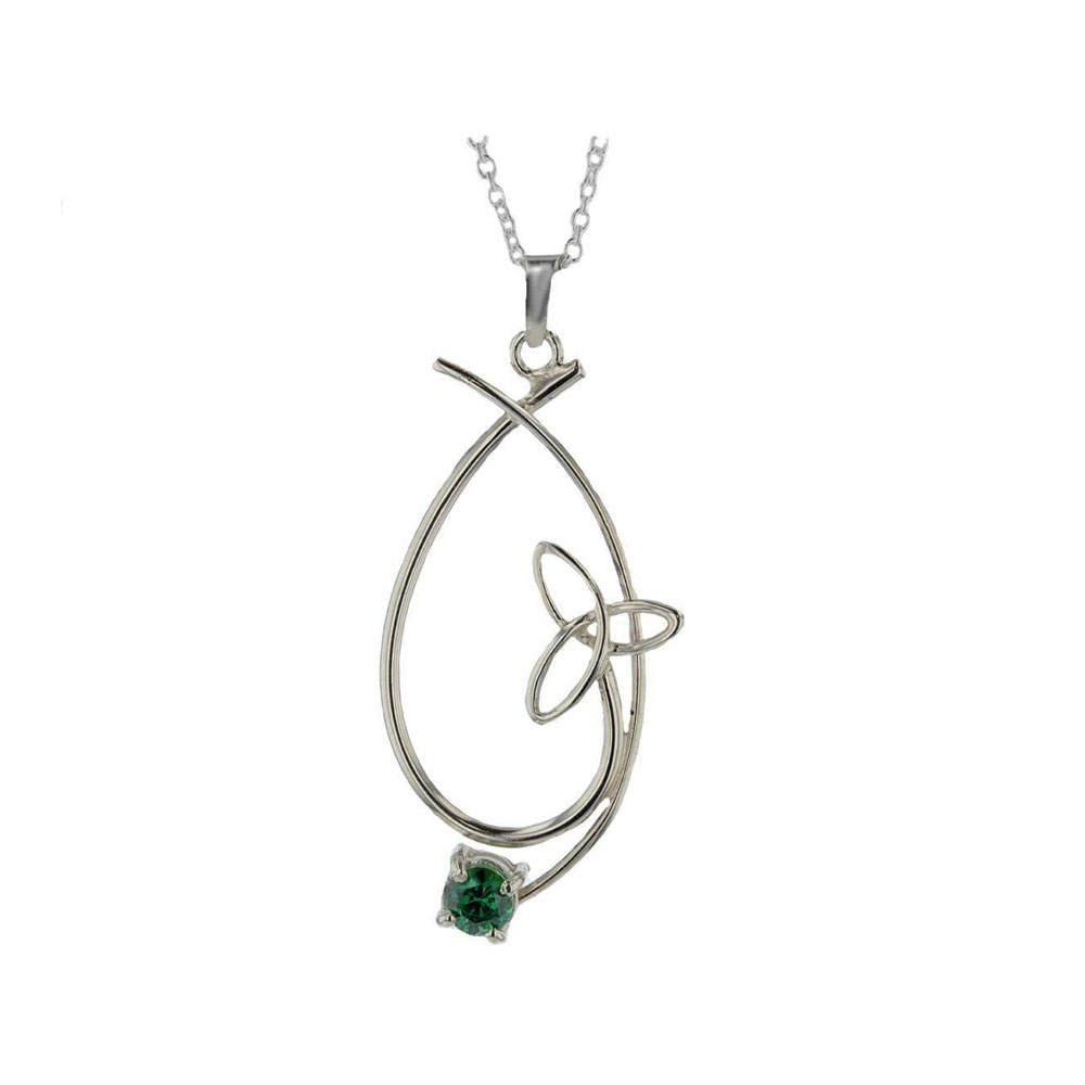 Handmade Irish trinity knot pendant representing a never ending bond with green cz claw set. This elegant and simple pendant and chain would make the perfect gift for someone you love.