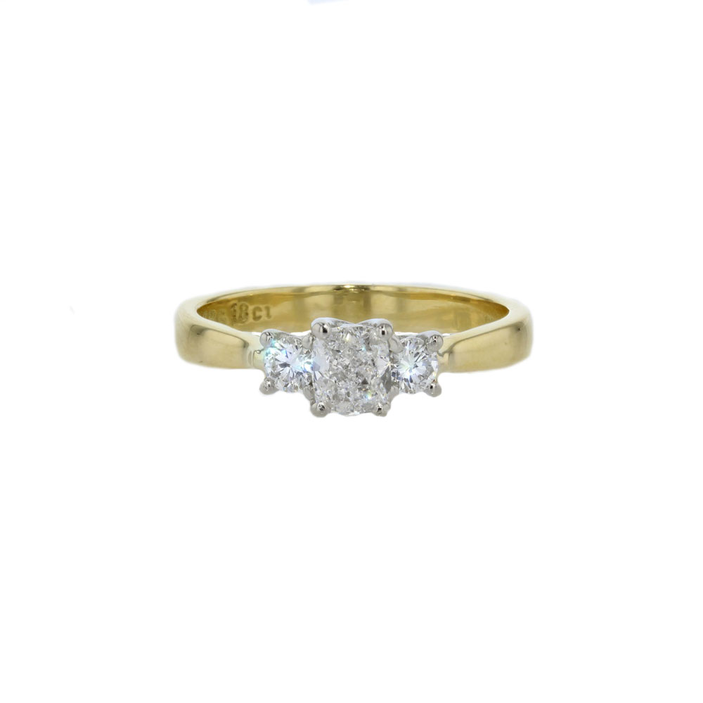 Symbolising your past, present and future life with your partner, our cushion cut 3 stone engagement ring or trilogy ring is truly stunning . This three stone 18ct gold ring with centre cushion cut 0.45ct diamond laser inscribed and GIA certified F colour, flanked by 2 brilliant cut diamonds on each side 0.10ct. giving it a beautiful symmetry on the hand.