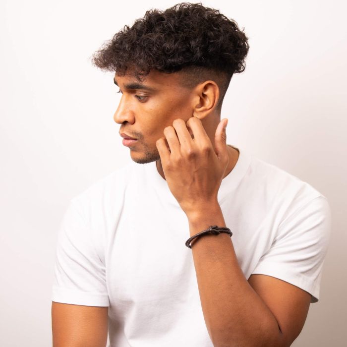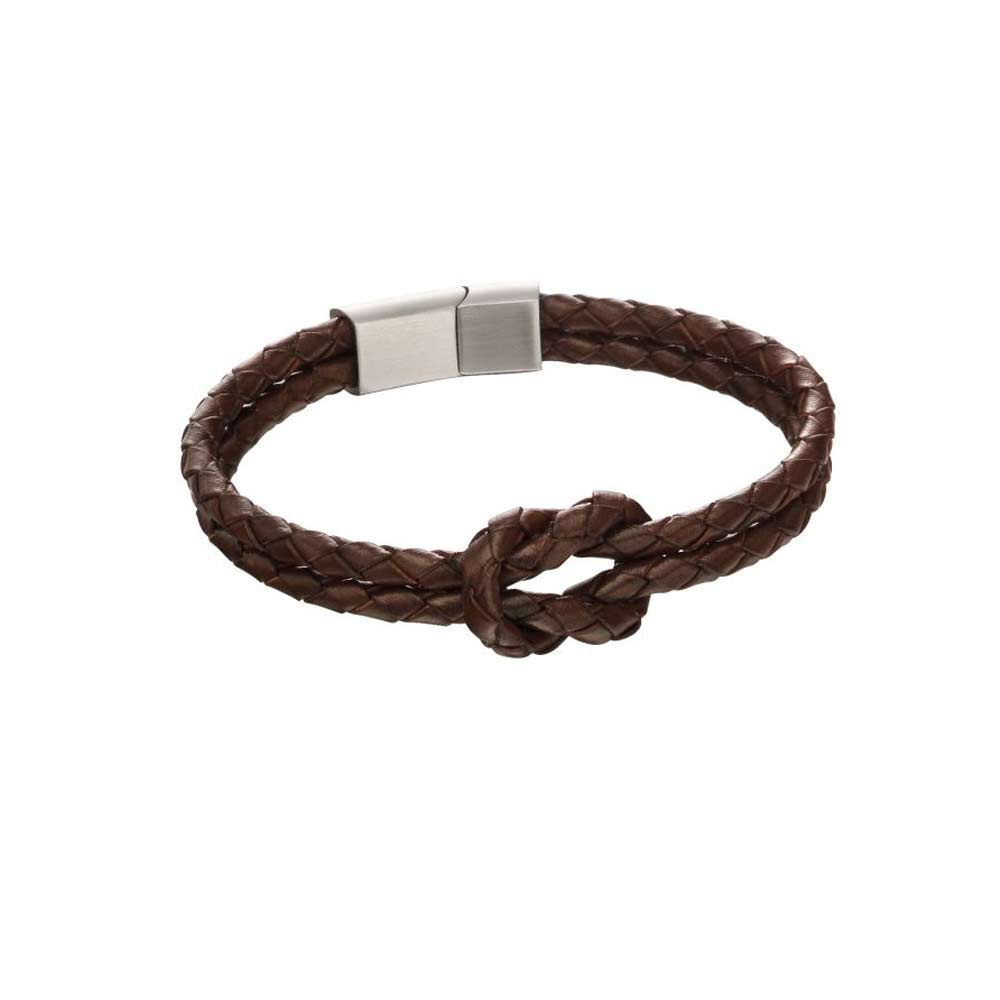Double row knot brown leather plaited bracelet with stainless steel brushed clasp. Layer up for a modern contemporary look. Available from Fred Bennett range in store.