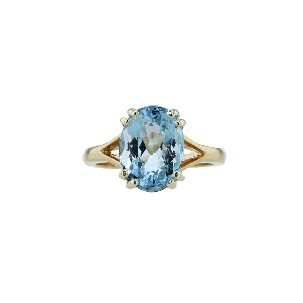 A rich blue 4.94ct. oval aquamarine set in a double claw stetting in white gold with 9ct yellow gold band. The birthstone for March the name comes from the Latin for ‘sea water’ easy to understand by looking at the it.
