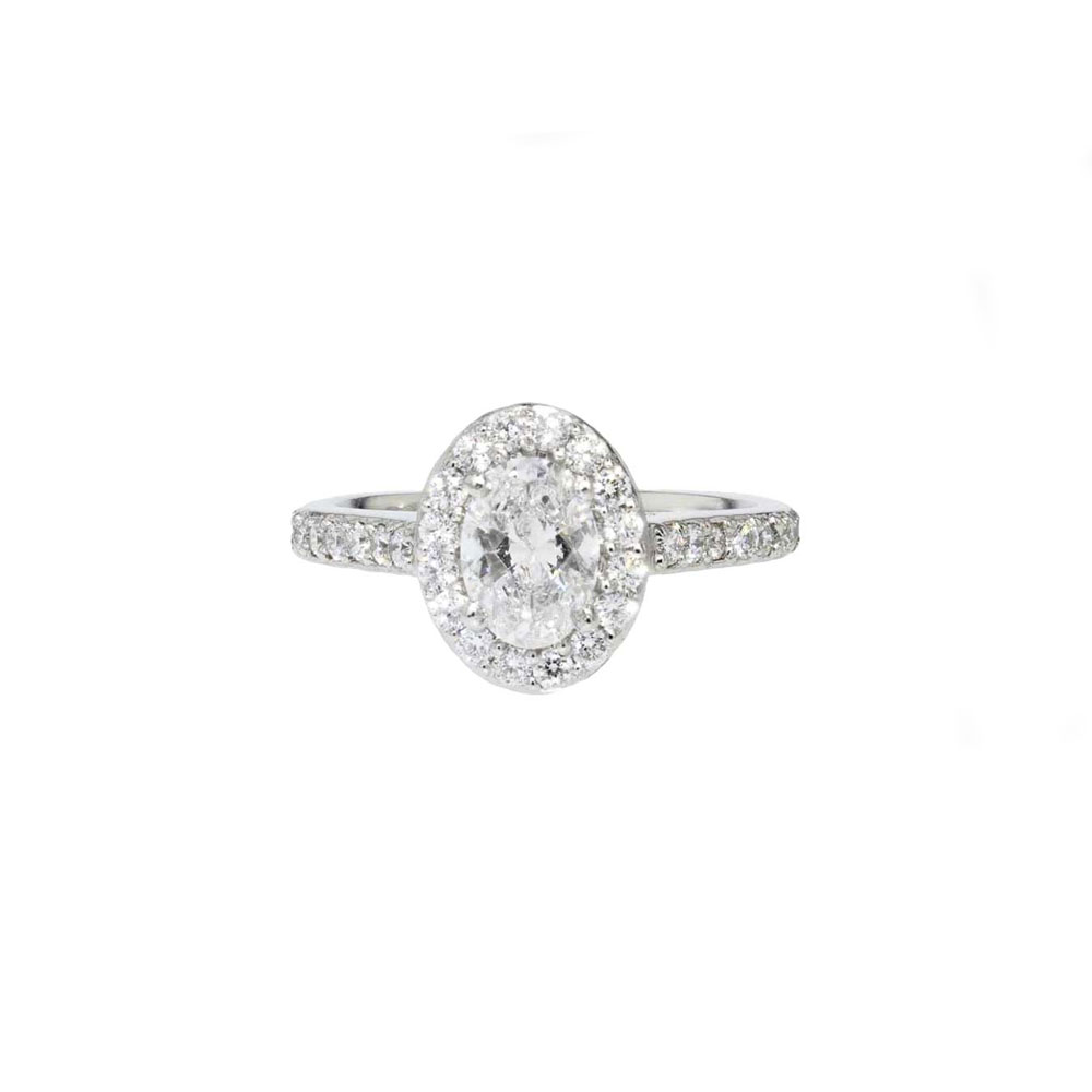 Platinum oval diamond cluster ring, centre diamond 0.80ct, surrounded by 16 diamonds and 16 diamonds on the shoulders. GIA certified diamond, G colour.