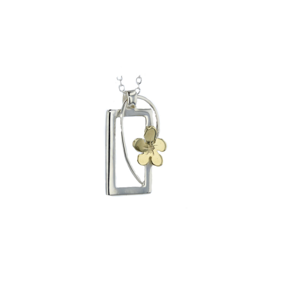 Handmade silver rectangular pendant with yellow gold Burren flower and wire detail on a sterling silver chain.