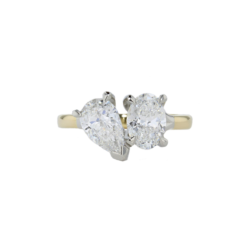 This stunning toi et moi ring features a 2.01ct total weight of lab grown diamonds set in a platinum setting and 18ct yellow gold band. The ring showcases a pear cut diamond nestled beside an oval cut diamond, both boasting a D colour and VS2/VS2 clarity. IGI certified.